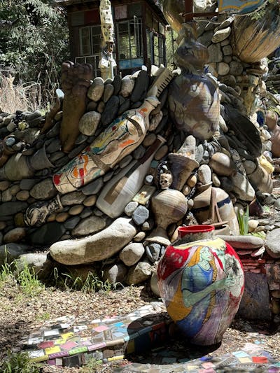 Mattie's garden also features the Great Wall of Chop Suey - an elaborate wall constructed out of concrete, pottery, found objects and other materials. “Chop Suey” translates to “assorted pieces”, and features in several of Mattie's other works. The wall is overlooked by a beautiful Chop Suey neon sign, rescued from Santa Cruz in the 1970s.