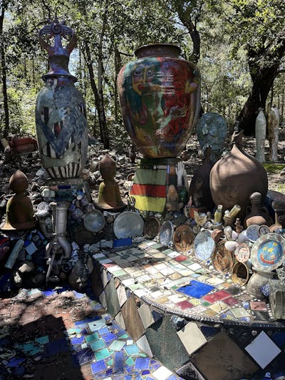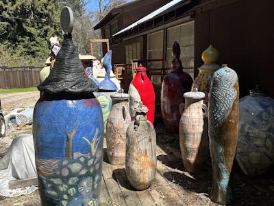 Mattie Leeds is a ceramic artist who has worked out of the same studio in the Santa Cruz mountains for more than 40 years. Over that time he has built up an astonishing sculpture garden displaying his work - hundreds of pots, many more than five feet tall, showcasing a delightful range of artistic styles and techniques.