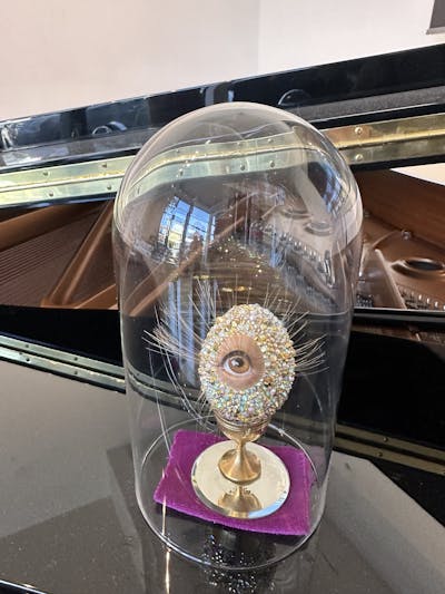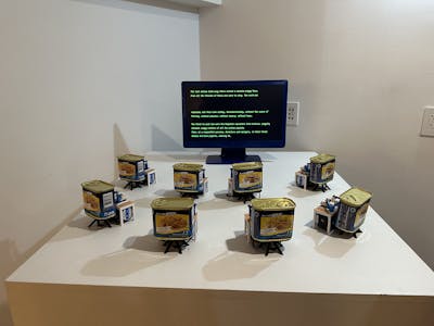 Spread over two floors, exhibits include a movie written and animated by AI tools, a self-playing piano with music composed by bacteria and a delightful set of robotic spam cans typing out spam content generated by a model trained on Aldous Huxley's Brave New World.