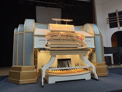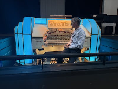 Upstairs is the concert hall, a dedicated 245 seat performance venue constructed around the museum's "Mighty Wurlitzer" theater pipe organ. This incredible instrument was built in 1928, shipped from New York to London in 1932 to work in a movie theater in Kingston, used on BBC transmissions in the 40s and 50s and then later rescued by Frank in 1960. The organ is mounted on a stage lift and connected up to dozens of instruments including 890 hidden pipes, percussion, sound effects and a piano that can be remotely controlled by the organ.